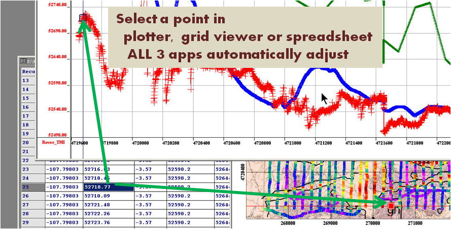 - A memory connected spreadsheet, plotter and grid display: spreadsheet functionality and information display is critical when working with data but multi-dimensional relationships are also important. The plotter provides the ability to plot channel(s)(function) versus any channel or versus the record number. But the application allows the user to naturally split their data into subsets (called lines in QCTool). The plotter plots one subset but the Grid Tool displays any channel as a function of any other 2 channels for the entire data set. The important criteria is that these three tools are fundamental to data analyses and these tools are therefore constantly linked in memory. When selecting a record in the mapped and plotted channel, this record is automatically selected in all three tools as illustrated above.